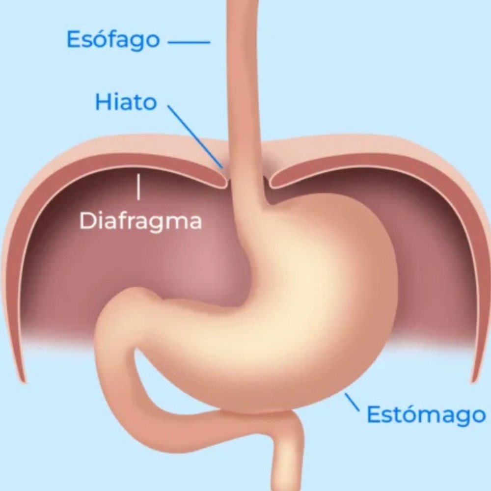 La hernia de hiato es una condición en la que una parte del estómago se desplaza hacia el tórax a través del hiato esofágico, una abertura natural en el diafragma por donde pasa el esófago. Este desplazamiento puede alterar el funcionamiento normal del esfínter esofágico inferior, facilitando el reflujo del ácido gástrico hacia el esófago.